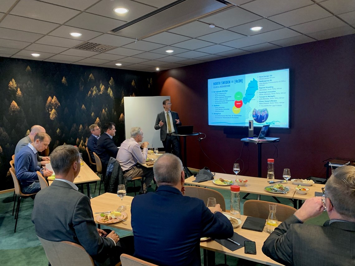 Dagen fortsatte med ett lunchmöte för inbjudna från näringslivet med också politiken med flera i Örnsköldsvik med fokus på skogsnäringarna och en diskussion kring EU:s skogspolitik. Mikael Janson inledde med att berätta om North Sweden och arbetet för att stärka det samlade regionala arbetet gentemot EU med sikte på bland annat bioekonomi som är ett utpekat område av EU. Tanken är att följa upp det arbete kontoret gjort för att bidra till att stärka norra Sveriges roll i EU:s rymdpolitik, som nu bär frukt i att såväl akademi som företag och regionens företrädare är delaktiga i EU:s satsningar på att bli en global rymdaktör. Lotta Rönström fokuserade i sin presentation på den snabba gröna industriomställning som sker i norr och behovet av att möta denna med utbyggd grön infrastruktur. North Sweden arbetar intensivt i den pågående revideringen EU:s transportpolitik för en inkludering av exempelvis transportnoder såsom terminaler och ytterligare hamnar i EU:s transportnätverk för att underlätta en överflytt av gods från väg till järnväg. Lunchen avslutades med att Anna Holmberg från Skogsindustriernas Brysselkontor kopplade upp sig för en genomgång av det tunga klimatlagstiftningspaketet ”Fit for 55” som nu ligger för förhandlingar i EU.