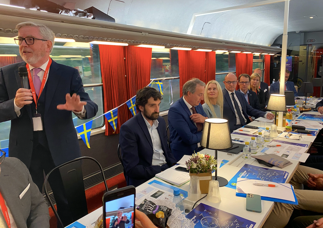 För att lyfta vikten av utbyggd infrastruktur i norra Sverige arrangerade samarbetet Botniska korridoren (BK) ett seminarium ombord på tåget med rubriken ”What is the future of green industry without green infrastructure?”. Botniska korridoren är ett samarbete mellan de sju nordligaste regionerna i Sverige och representerades på tåget av två ledamöter från BK:s styrgrupp: Birgitta Sacrédeus KD, regionråd i Dalarna och Jan Lahenkorva S, regionråd i Gävleborg. Från Botniska korridorens sida medverkade även Henric Fuchs, infrastrukturstrateg i Region Västernorrland; Christoffer von Bothmer, Projektledare för BK; Ingela Bendrot, VD för Nya Ostkustbanan, och Lotta Rönström från North Sweden-kontoret som modererade samtalet.