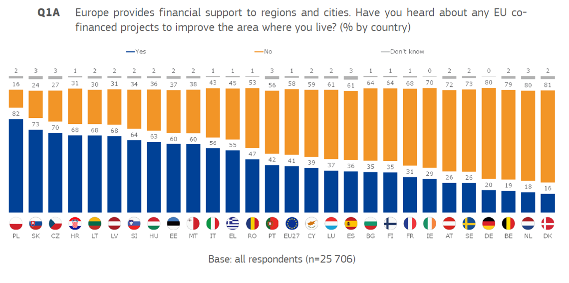 För att undersöka deltagarnas kännedom om EU:s regionalpolitik ställdes bland annat frågan om de hört talas om något EU-samfinansierat projekt som syftar till att förbättra området där de bor. Där svarade bara 26% av svenskarna ja, medan EU-genomsnittet ligger på 41%. Att bara en fjärdedel av svenskarna hade kännedom placerar även Sverige som det fjärde landet med lägst kännedom av regionalpolitiken i EU. Av de svenskar som hade hört talas om EU-samfinansierade projekt svarade dock en stark majoritet att projekten har haft en positiv inverkan på sin stad eller region.