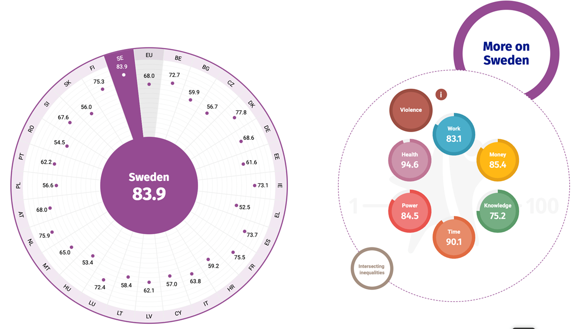 Under EU:s jämställdhetsvecka i slutet av oktober presenterade Europeiska jämställdhetsinstitutet (EIGE) 2021 års jämställdhetsindex. Sverige toppar återigen listorna som det mest jämställda landet i EU med 83.9 av 100 maximala poäng, medan EU-snittet ligger på 68 poäng. Fokus i årets mätningar låg på hälsa.