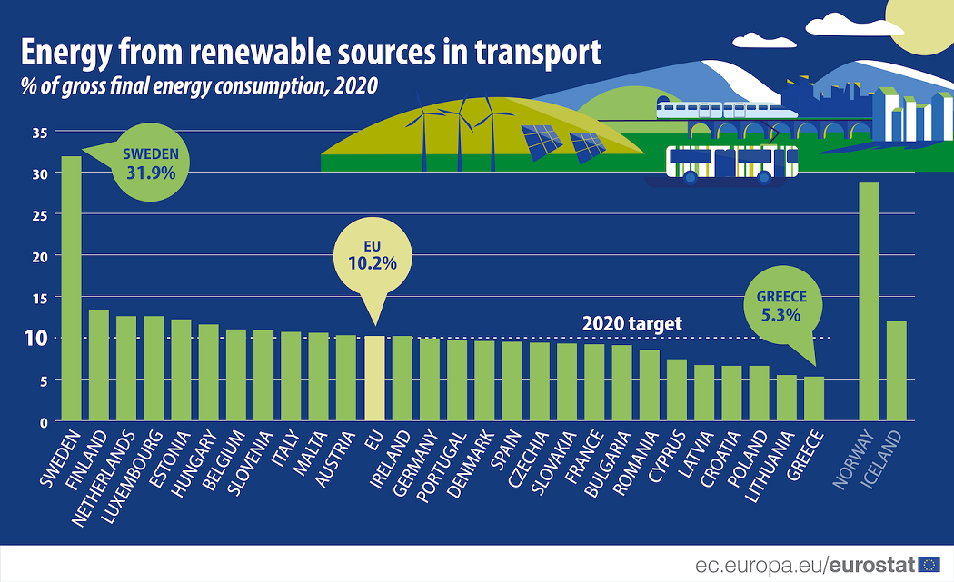 En sammanställning från Eurostat visar att andelen förnybara energikällor som användes i den svenska transportsektorn under 2020 var närmare 32 procent. Det är mer än tre gånger så mycket som EU-snittet. Detta beror enligt Eurostat på den ansenliga mängd biobränslen som används i Sverige.