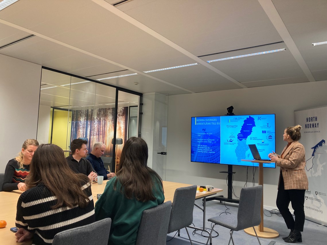 När lunchdags närmade sig återvände gruppen till North Swedens kontor för att lyssna på Anette Westberg, som arbetar på EU-kommissionens Generaldirektorat för havsfrågor och fiske (DG MARE). Anette, som ursprungligen kommer från Älvsbyn, delade med sig av sin personliga och professionella resa med över 20 års erfarenhet på EU-kommissionen. Hon berättade om sina erfarenheter och insikter från sitt arbete och gav gruppen en inblick i hur det är att leva i Bryssel.