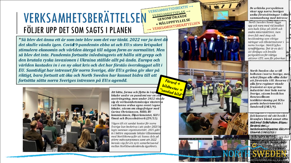 Direktivet konkretiseras sedan i styrelsens verksamhetsplan och det är verksamhetsplanen med sina insatsområden och målsättningar som verksamhetsberättelsen följer upp. Verksamhetsberättelsen för 2022 behandlades vid Ägarrådet och belyser det omfattande arbete som kontoret gör, med möjligheter för den som verkligen vill att grotta ned sig i alla olika aktiviteter och bedömda utfall kopplat till målsättningarna inom varje verksamhetsområde. 2022 var inget undantag i att det är mycket som sker och kontoret gör, snarare tvärtom, men för den som vill få en mer övergripande bild så är tanken att förordet och de inlagda bilderna med bildtexter kan ge en överflygning kring North Swedens arbete för den som önskar det.