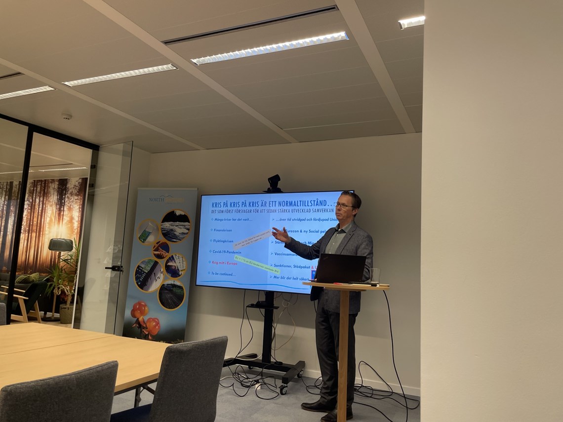 Efter lunch begav sig eleverna till North Swedens kontor. På North Sweden blev eleverna välkomnade av Mikael Janson, direktör på North Sweden European Office, som presenterade North Sweden European Office arbete på Brysselarenan. Eleverna fick en inblick i våra policyområden samt bevakningsområden och fick lära sig vart i EU-processen regionkontor kan genomföra påverkansarbete. Mikael Janson förklarade vikten i samverkan och berättade att det är en viktig beståndsdel för att synliggöra norra Sverige på EU-arenan.