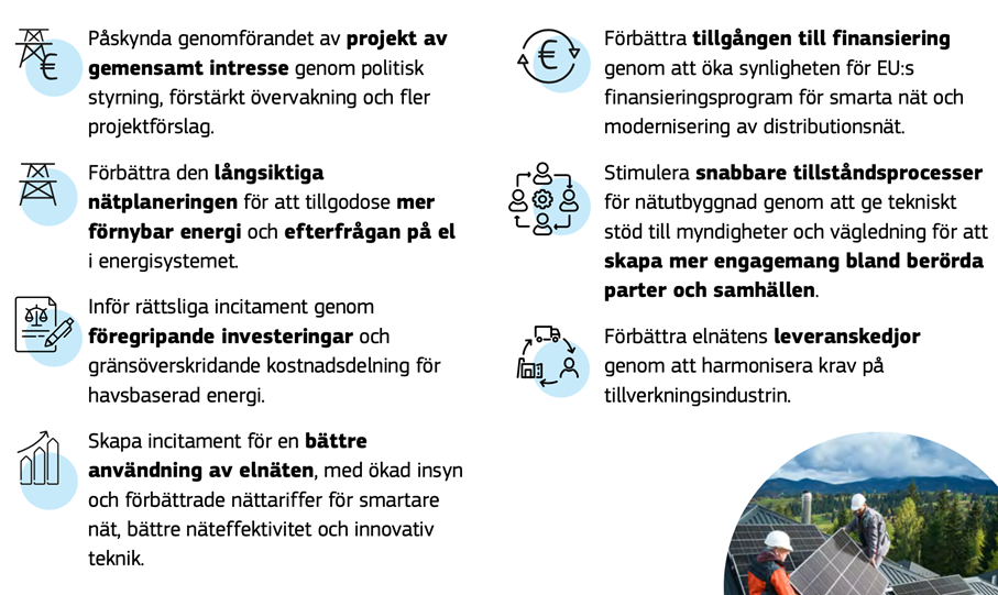 För att stärka elnäten och främja övergången till ren energi föreslås flera åtgärder. Det inkluderar att påskynda genomförandet av gemensamma projekt genom politisk styrning och ökad övervakning. Långsiktig nätplanering bör förbättras för att möta ökad efterfrågan på förnybar energi. Rättsliga incitament, som föregripande investeringar och kostnadsdelning för havsbaserad energi och för att optimera användningen av elnäten. EU-kommissionen betonar också ökad insyn och förbättrade nättariffer för smartare nät.