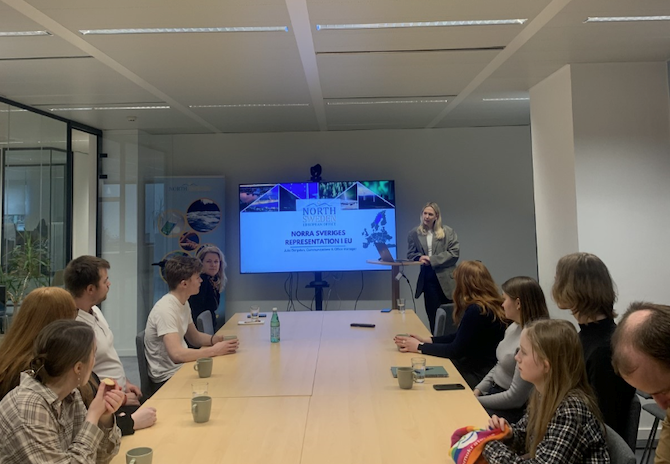 Ett av stoppen under resan var hos North Sweden där Julia Bergsten höll i den första presentationen. Gruppen fick en introduktion i kontorets dagliga arbete, de olika policyområden som North Sweden arbetar med samt varför regional och lokal representation är viktigt på EU-arenan. Vidare fick gruppen lära sig mer om hur North Sweden arbetar för att lyfta fram norra Sveriges perspektiv och intressen på Brysselarenan där bland annat vikten av att förstå glesbygdens och mindre städers förutsättningar i den europeiska arktiska regionen.
