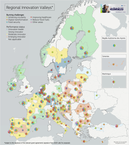 Som ett led i genomförandet av innovationsagendan har EU-kommissionen nu utsett 151 regioner som ska bidra till att genomföra denna vision och vidareutveckla den regionala dimensionen av EU:s innovationspolitik. Innovationsstrategin annonserade även en viss finansiering för RIV-projekt genom Horisont Europa (European Innovation Ecosystem) och ERUF (Interregional Innovation Investments) i en separatprocess.