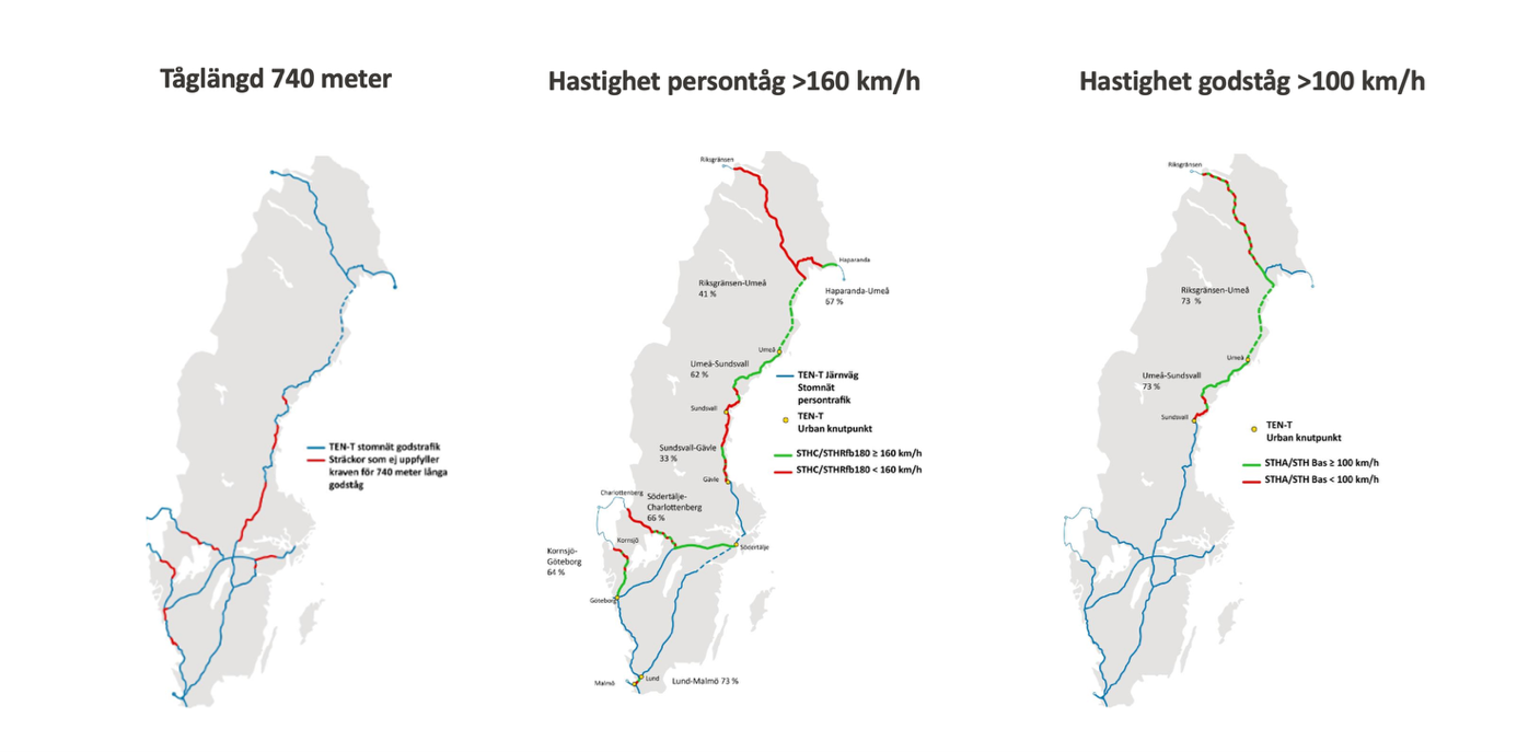 Det går heller inte i linje med TEN-T där Ostkustbanan och Ådalsbanan är del av den högst prioriterade europeiska transportkorridoren Skandinavien-Medelhavet som ska stå klar utifrån kraven i TEN-T till 2030. Trafikverket presenterade så sent som i februari i år en rapport kring TEN-T-kraven där det tydligt pekas ut att varken kraven på hastighet eller tåglängd nås i det stråket, som kartorna nedan visar.