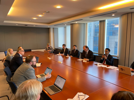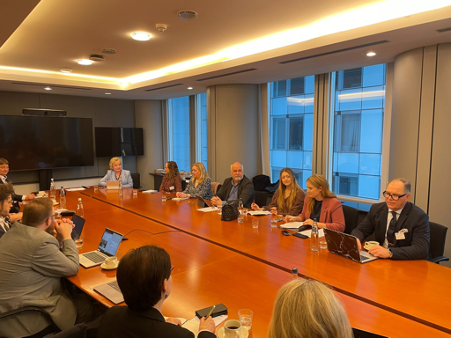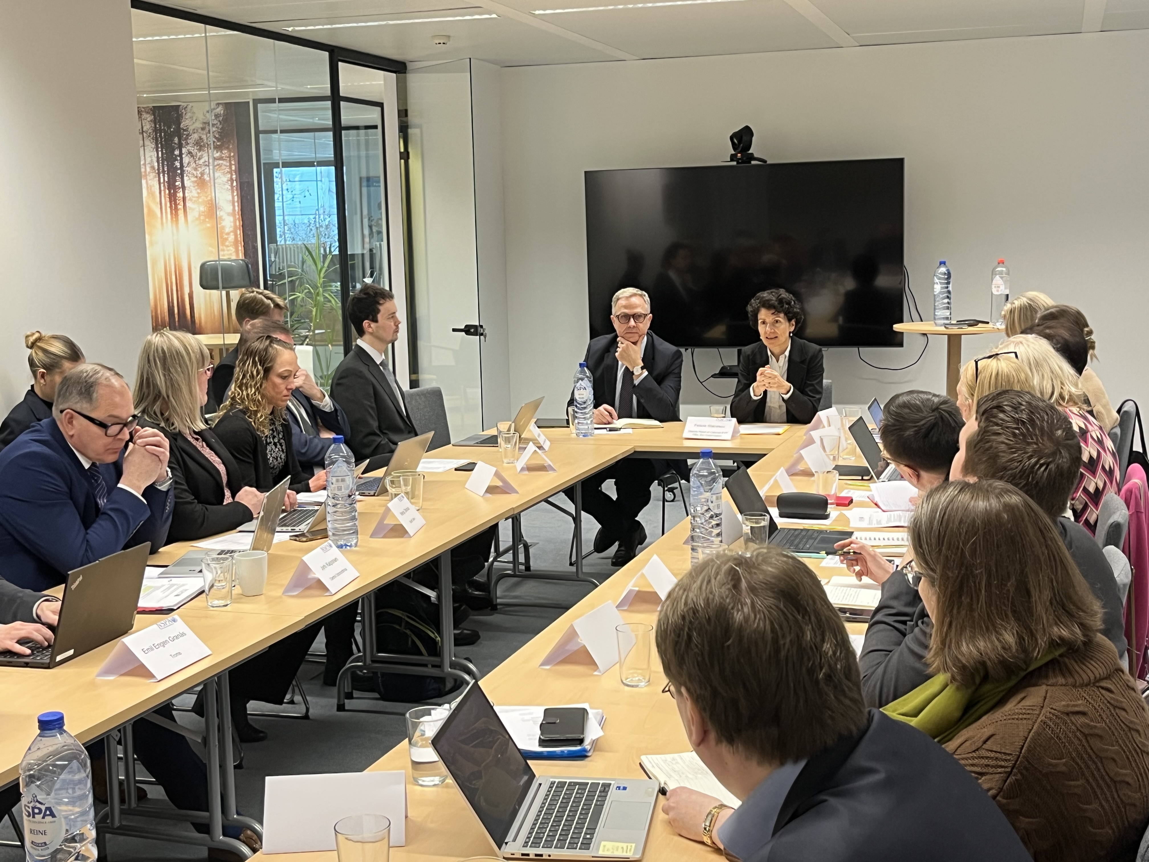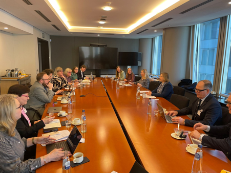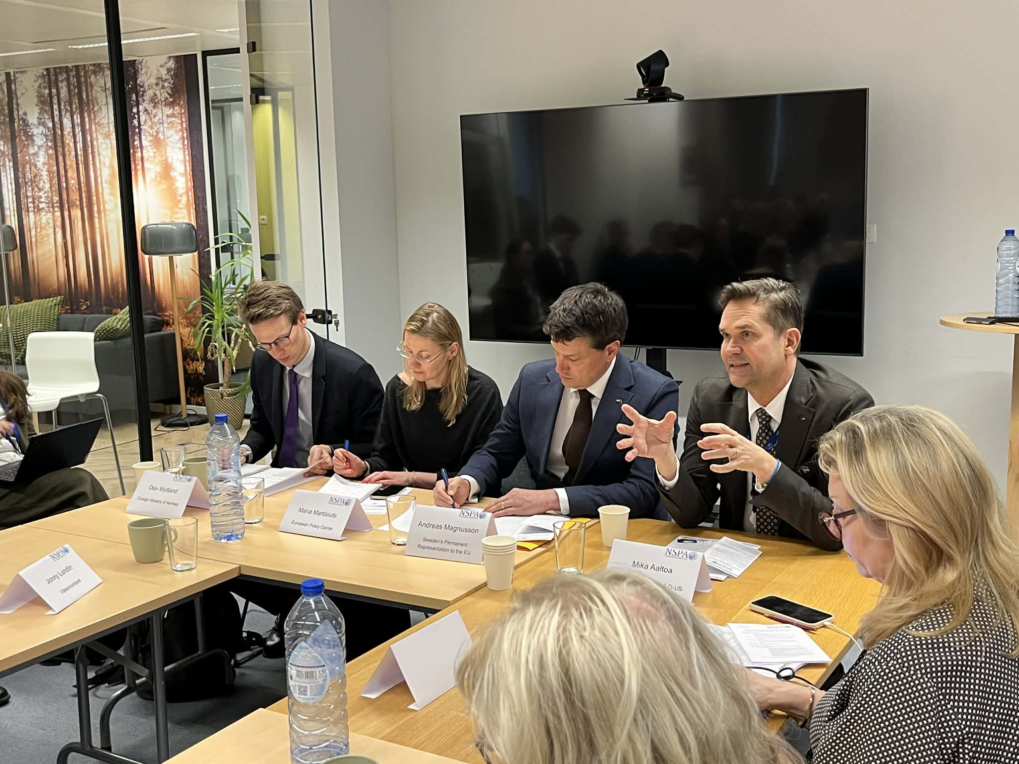 Efter rundabordssamtalet fortsatte diskussionerna i Europaparlamentet tillsammans med Karin Karlsbro, europaparlamentariker i utskotten för handel (INTA), miljö (ENVI) och fiske (PECH). Under mötet diskuterades Arktis såväl som handelsfrågor och geopolitiska spänningar, och hur dessa påverkar EU som helhet samt NSPA-regionerna, vilka i egenskap av stora exportörer av råvaror och med långa avstånd till marknader snabbt märker av förändrade handelsbalanser och leveranskedjor. Under diskussionen lyfte NSPA-representanterna hur viktigt det är att fortsätta stödja lokalsamhällen så att dessa kan stärkas i fredstid för att kunna hålla ställningarna i orostider. Mötet avslutades med en uppmaning från Karin att fortsätta lyfta NSPA-frågorna till beslutsfattare på såväl europeisk som nationell nivå, då dessa är högst aktuella och det behövs lokala röster som berättar om vad strategiskt viktiga regioner behöver.